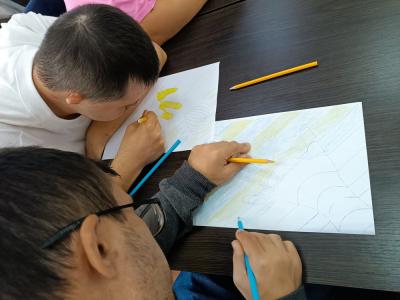 Під час зустрічі учасники познайомилися з ілюстраціями робіт у цій техніці, про її принципи – повторювані візерунки, контрастні кольори, плавні переходи та оптичні викривлення, що створюють ефект тривимірності.